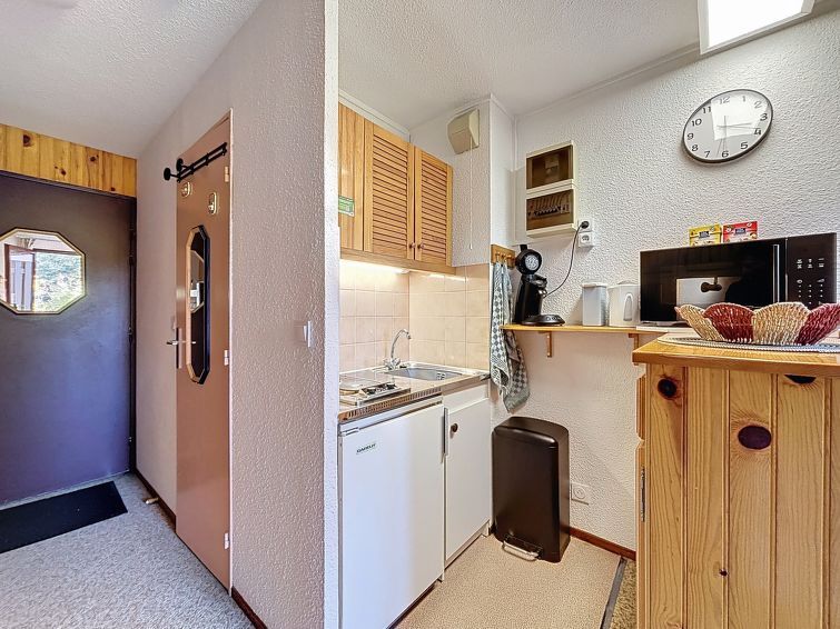 Studio 17 m2 au 1er étage. Salle à manger avec 1 lit pliant (140 cm, longueur 190 cm), TV (écran plat), chauffage électrique. Sortie sur le balcon, orientée sud-ouest. Entrée avec 1 x 2 lits superposés (80 cm, longueur 190 cm). Coin cuisine (2 plaques de cuisson, bouilloire électrique, micro-ondes, cafetière électrique, Capsules pour machine à café (Senseo)). Douche/WC. Chauffage électrique, chauffe eau (100 litres). Petit balcon, situation sud-ouest. Mobilier de balcon. Vue sur les montagnes. Veuillez noter: logement non-fumeur. Détecteur de fumée. Au lieu d'une chambre fermée, des espaces de couchage sont situés dans une zone ouverte (galerie, alcôve...). Linge de maison, serviette de bain, ménage final et coûts énergétiques inclus. Annonce d'un particulier (art 155, IV du CGI).