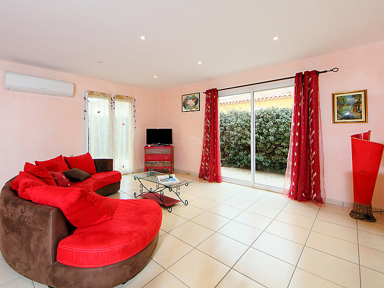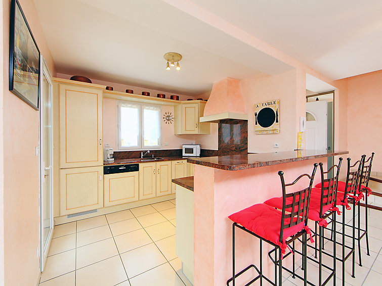 Villa 4-kamers 140 m2 op 2 verdiepingen. Woon-/eetkamer met TV en air-conditioning. 1 kamer met 1 2-pers bed (160 cm, lengte 200 cm). Open keuken (oven, afwasmachine, 4 keramische glas kookplaten, magnetron, diepvriezer, elektrische koffiemachine) met doorgeefluik. Douche, aparte WC. Bovenverdieping: 2 kamers, elke kamer heeft 1 2-pers bed (140 cm, lengte 190 cm). Bad/WC. Elektrische verwarming. Terras overdekt. Terrasmeubelen, barbecue. Ter beschikking: wasmachine, strijkijzer. Internet (Internet (WiFi), extra). Garage, hoogte 185 cm, breedte 350 cm. Rookmelders.