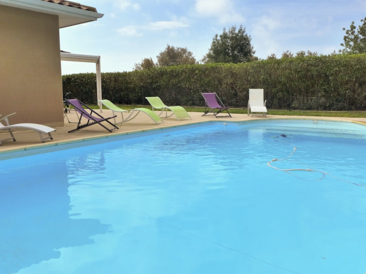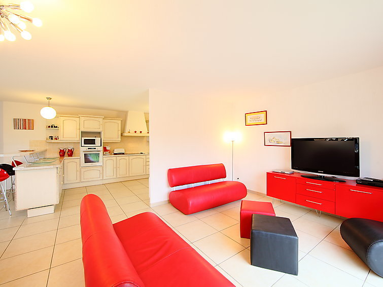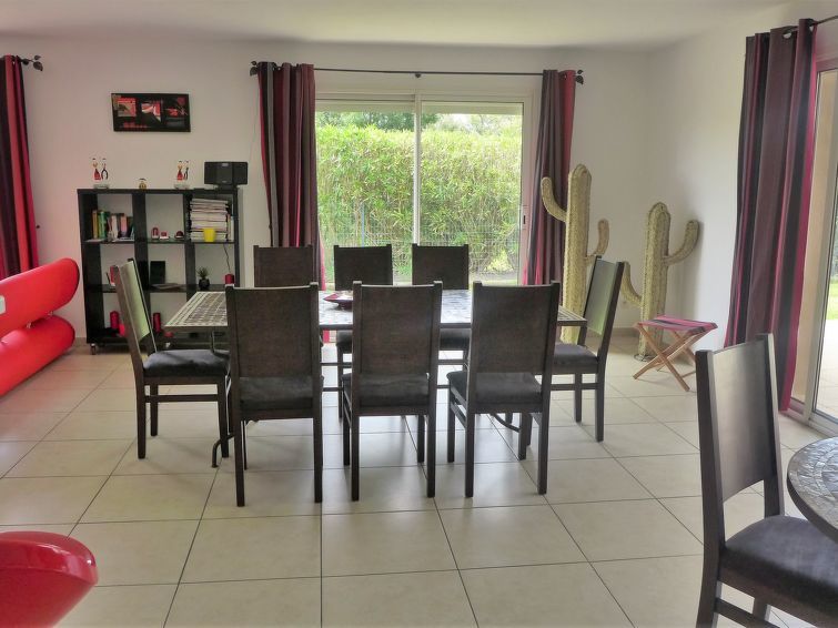 Villa 5-kamers 140 m2. Comfortabel ingericht: woon-/eetkamer met TV, Sat-TV en internationale TV-zenders (Flatscreen TV), radio en DVD. Uitgang naar de tuin, naar het terras. 1 kamer met 1 2-pers bed (160 cm, lengte 200 cm), douche/WC. Uitgang naar de tuin. 1 kamer met 1 2-pers bed (160 cm, lengte 200 cm). Uitgang naar de tuin. 1 kamer met 1 2-pers bed (160 cm, lengte 200 cm). 1 kamer met 2 bedden (90 cm, lengte 190 cm). Open keuken (4-pits kookplaat, oven, afwasmachine, broodrooster, waterkoker, magnetron, diepvriezer, elektrische koffiemachine, pads voor de koffiemachine (Nespresso)) met bar. Bad/WC, aparte WC. Air-conditioning, heteluchtverwarming. Terras 47 m2, op het zuiden gelegen. Terrasmeubelen, ligstoelen. Ter beschikking: wasmachine, strijkijzer. Internet (Internet (WiFi), gratis). Parkeerplaats (1 Auto), garage (1 Auto). Rookmelders.