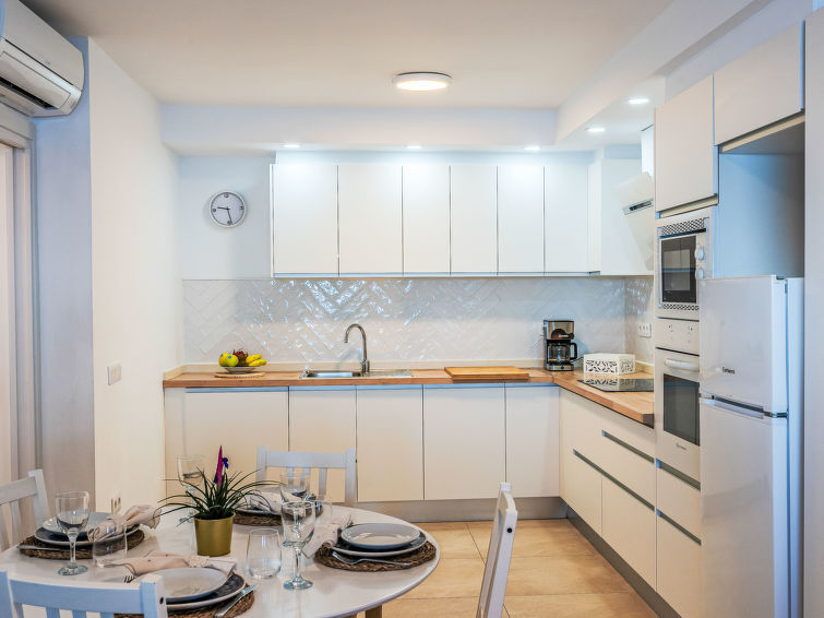 "Daura", appartement 3-kamers 72 m2, op de begane grond. Het objekt is geschikt voor 5 volwassenen. Licht, doelmatig en comfortabel ingericht: woonkamer met Digitale TV en Flatscreen TV. 1 kamer met 1 2-pers bed (140 cm, lengte 190 cm), air-conditioning. 1 kamer met 3 bedden (80 cm, lengte 190 cm), air-conditioning. Groot, open keuken (afwasmachine, 4 keramische glas kookplaten, broodrooster, waterkoker, magnetron, diepvriezer, elektrische koffiemachine) met eettafel, air-conditioning. Douche/bidet/WC. Boiler (50 liter). Geen verwarmingsmogelijkheid. Mooi uitzicht op zee. Ter beschikking: wasmachine, strijkijzer, kinderstoel, kinderbed tot 2 jaar, haardroger. Internet (WiFi, gratis). Geschikt voor families. Niet rokers woning. Geen lift. VV3510015479